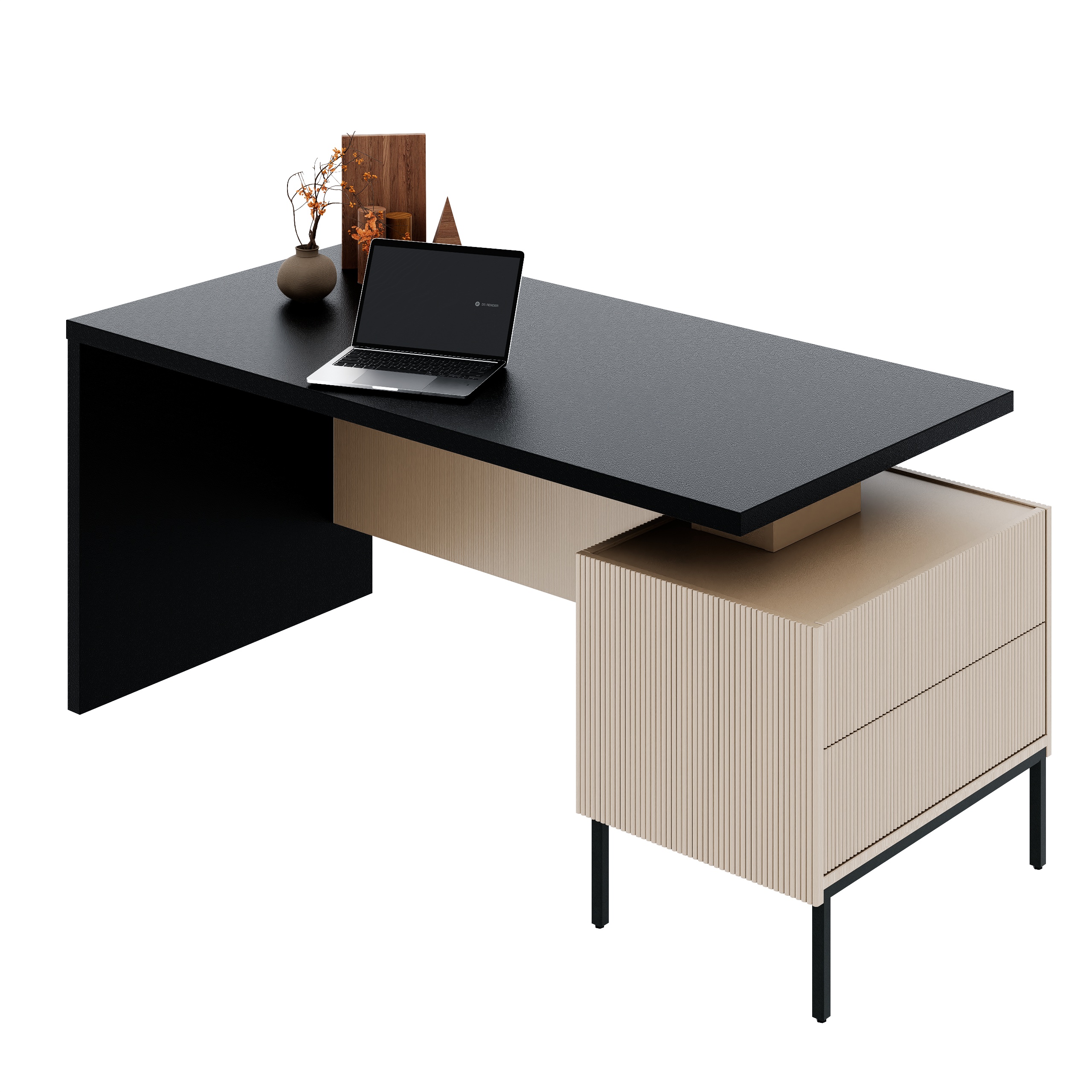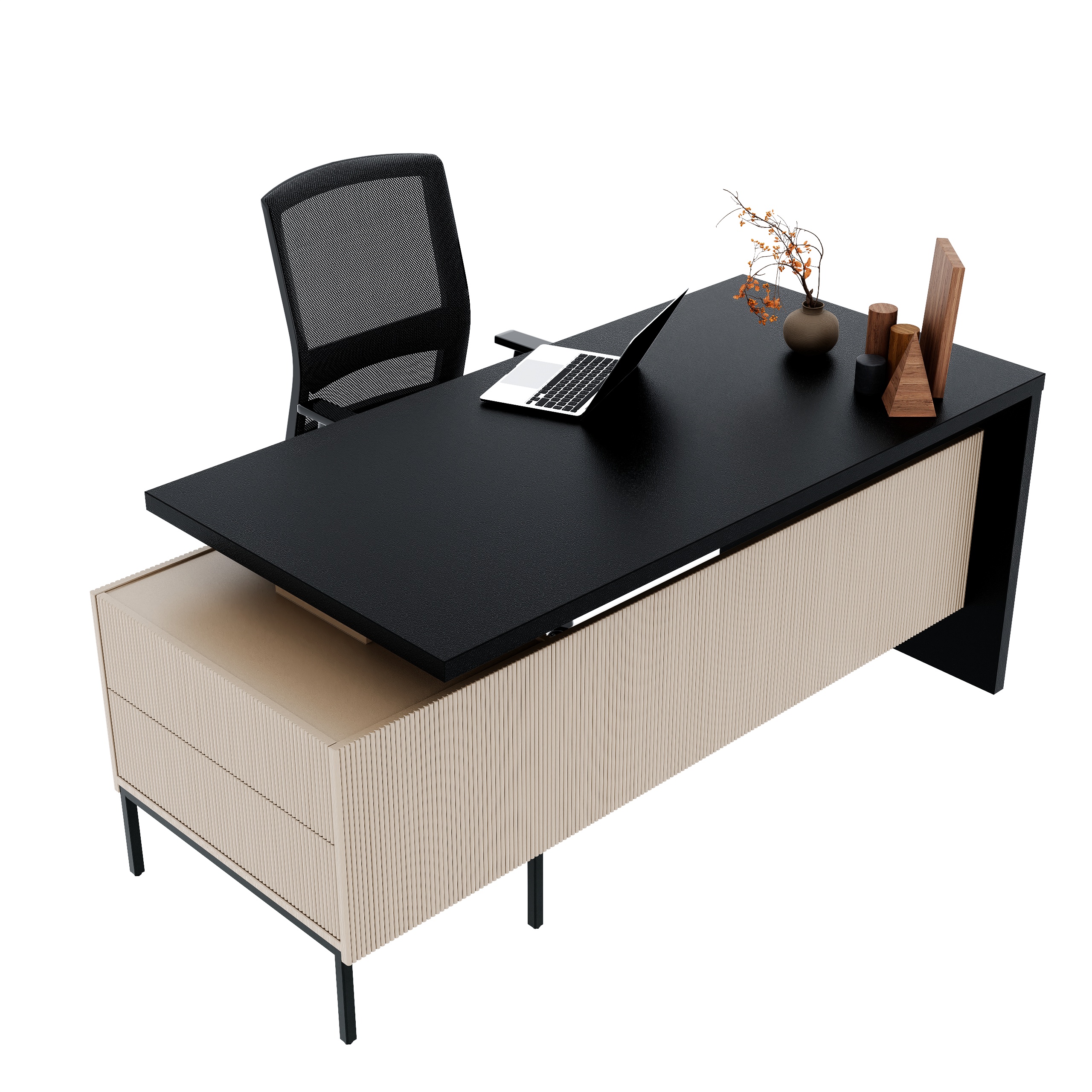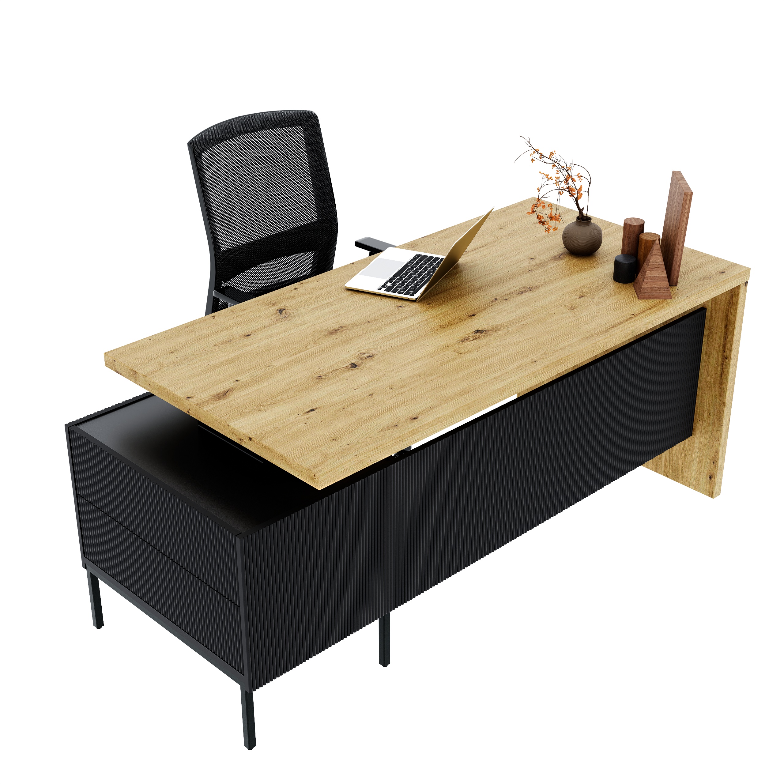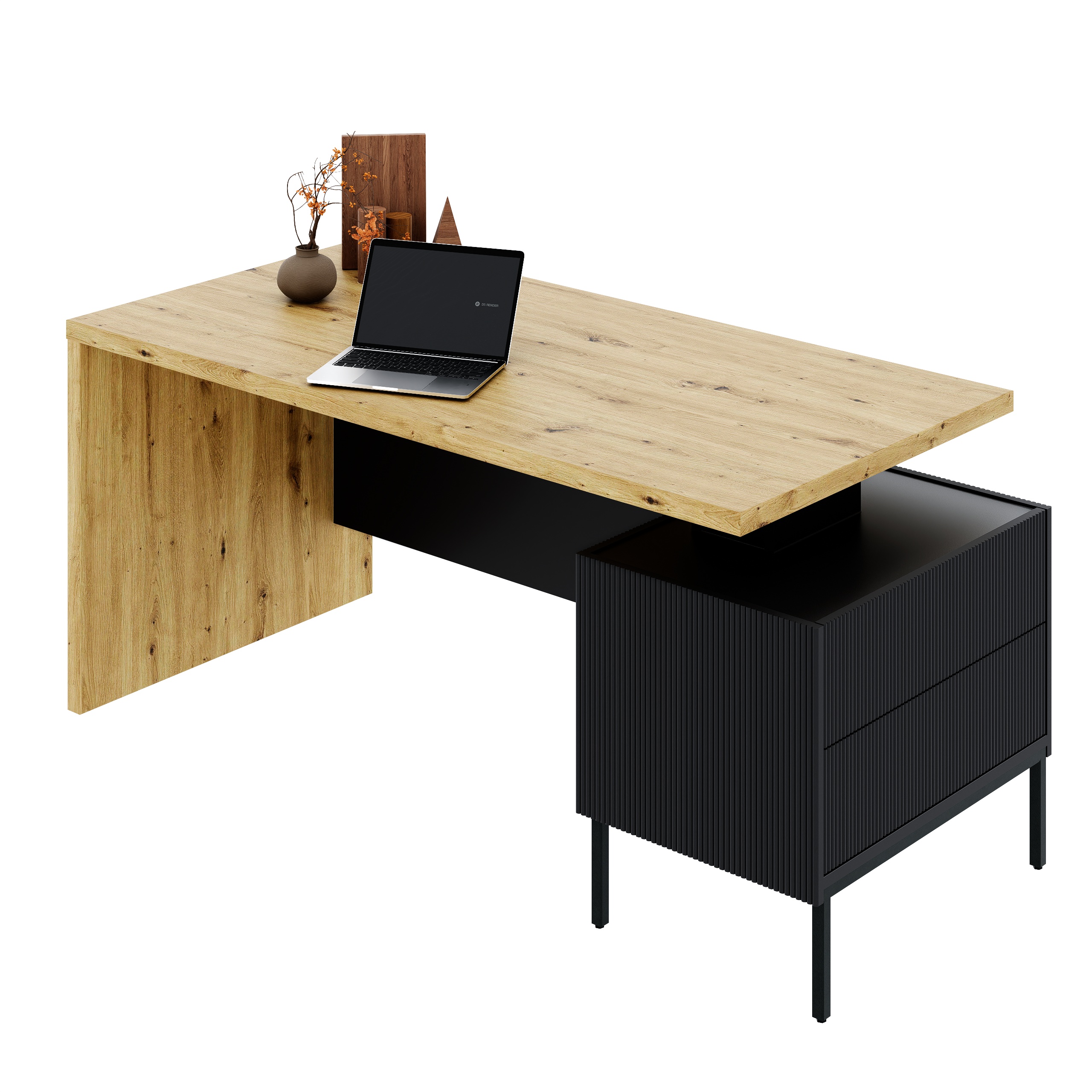 Na pierwszy plan wysuwa się ryflowana blenda, który nadaje całości wyrazistego, designerskiego charakteru. W zestawieniu z grubym blatem to solidne biurko przyciąga wzrok i wnosi do wnętrza naturalne ciepło oraz nutę elegancji.