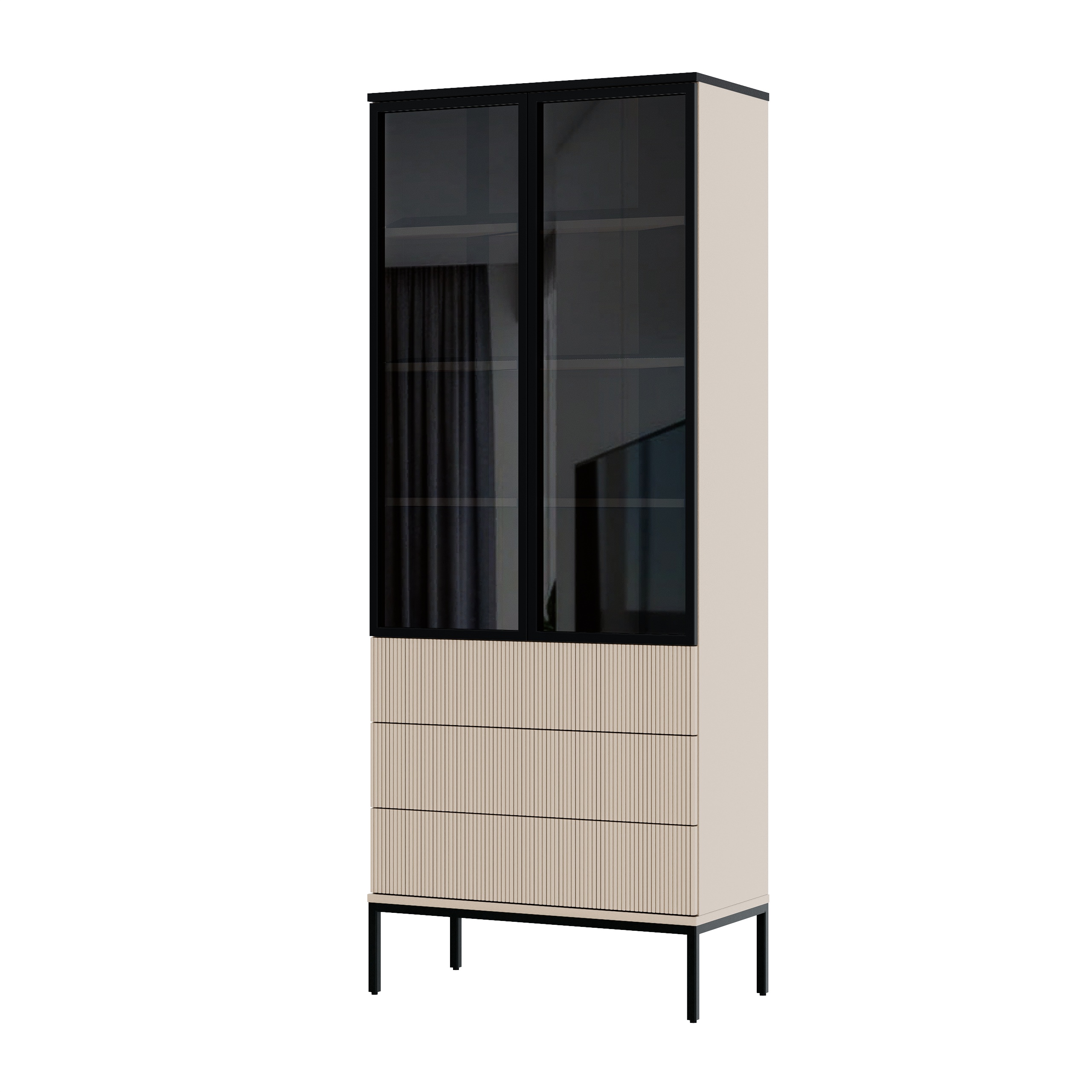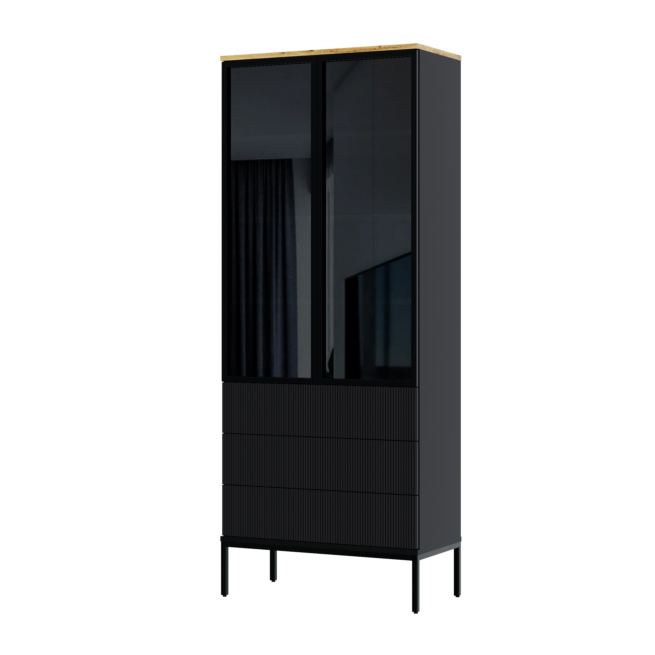 ✔ Przeszklone drzwi subtelnie eksponują zawartość – książki, dekoracje, szkło czy kolekcje.