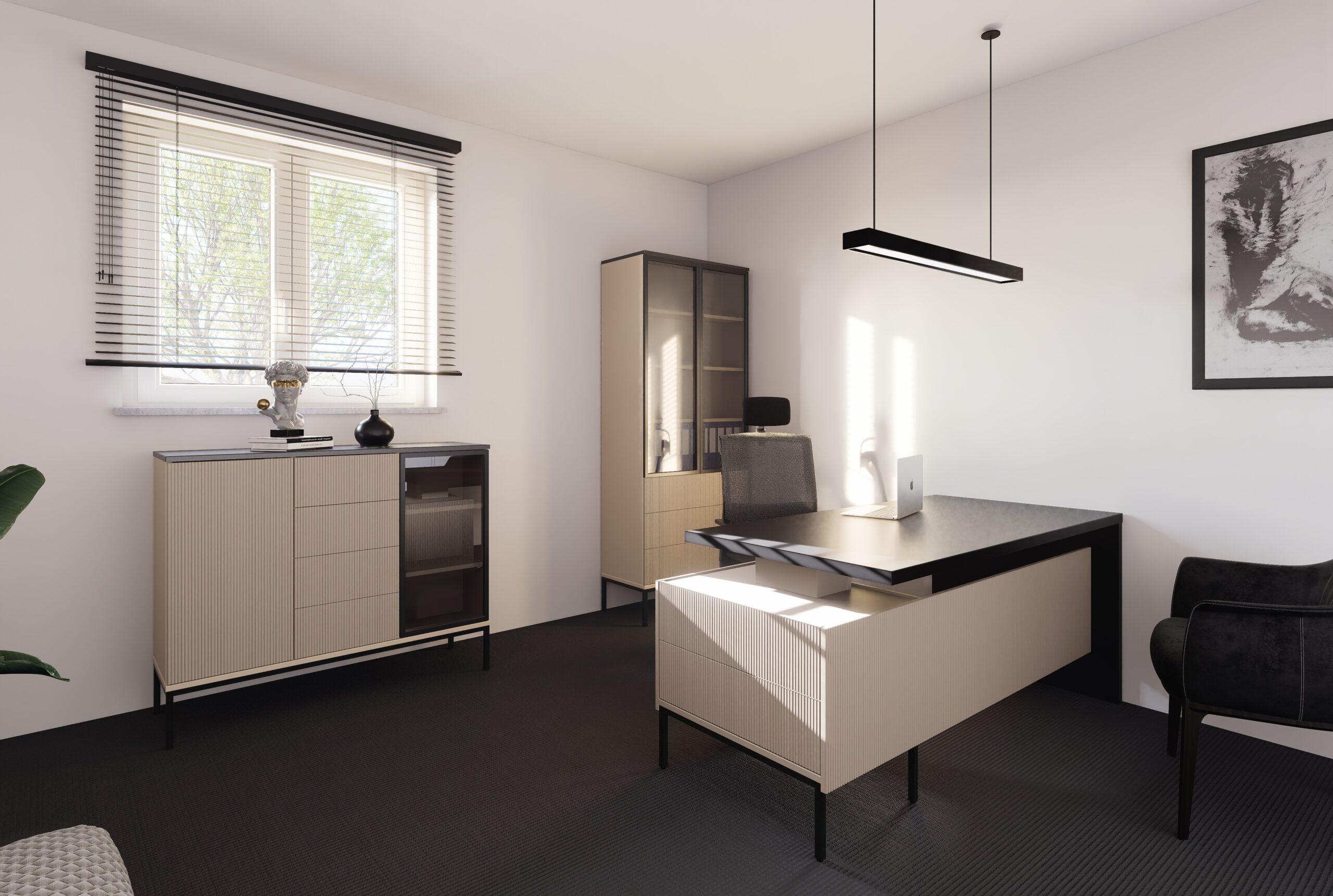 Kolekcja LINEA to połączenie ponadczasowej elegancji z nowoczesną formą. Subtelne ryflowania na frontach, matowe powierzchnie i kontrastowe wykończenia nadają meblom wyrafinowany i designerski charakter. W zestawie poza witryną: biurko i komoda – dostępne w dwóch wariantach kolorystycznych.